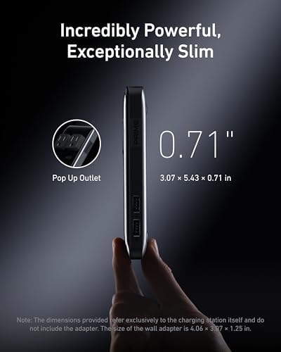 Minimal Space, Maximum Power: This ultra-compact charging station measures only 3.07 × 5.43 × 0.71 inches and includes a pop-up outlet for easy access.